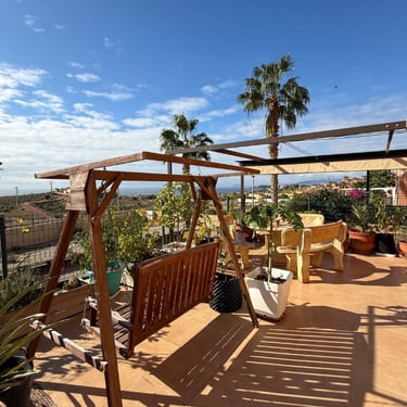 Zona ajardinada con pérgola, ideal para reuniones, comidas al aire libre o zona de relax